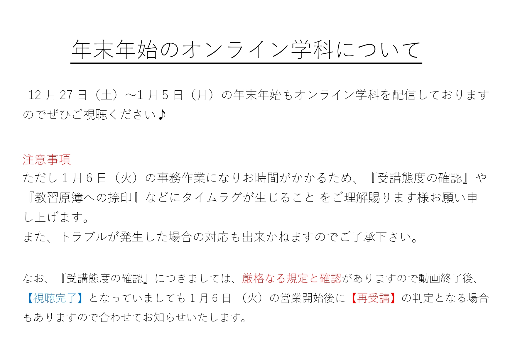 年末年始のオンライン学科について