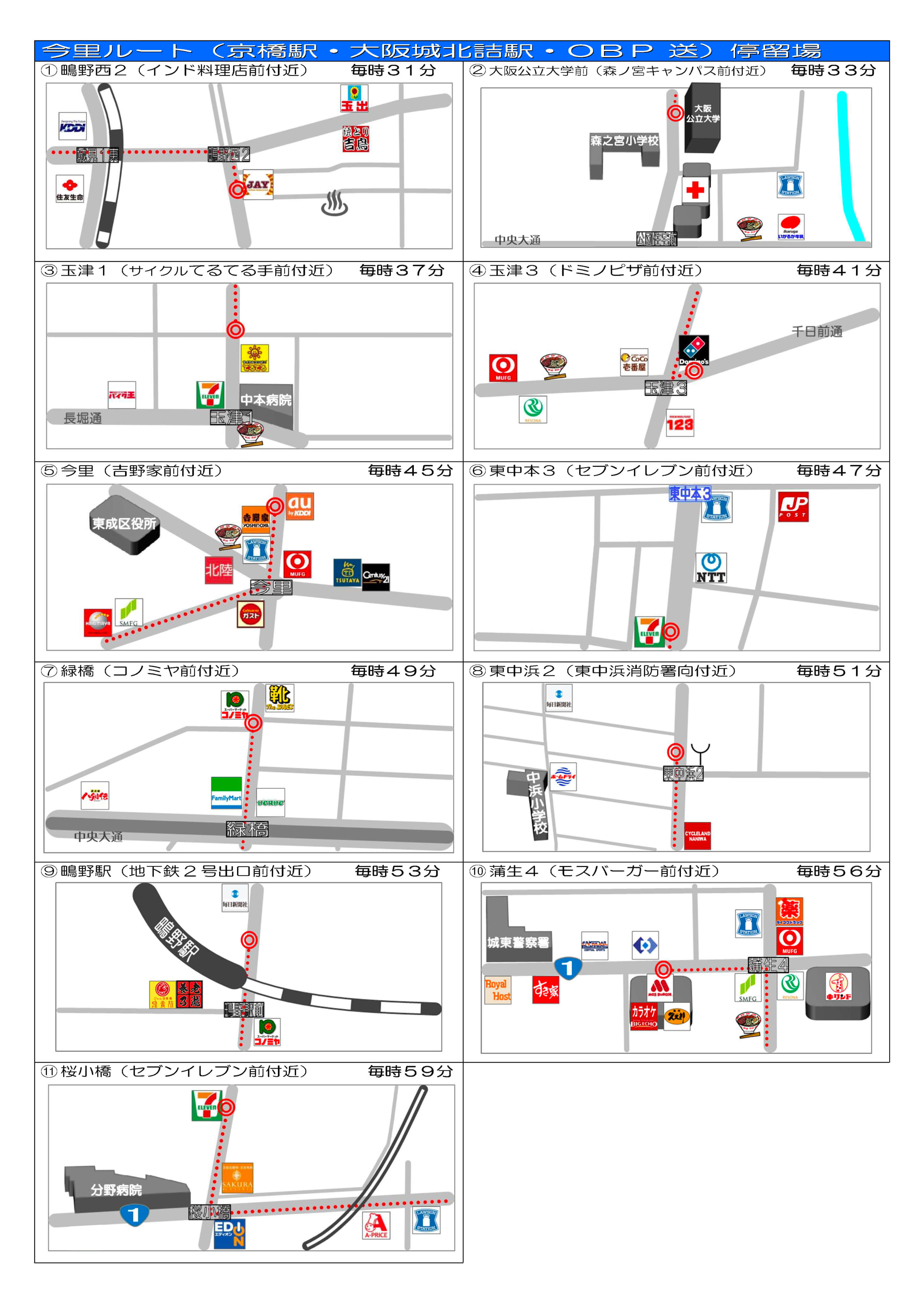 鴫野西2 | 大阪公立大学前 | 玉津1 | 玉津3 | 今里 | 東中本3 | 緑橋 | 東中浜2 | 鴫野駅 | 蒲生4 | 桜小橋 | 学校着 |