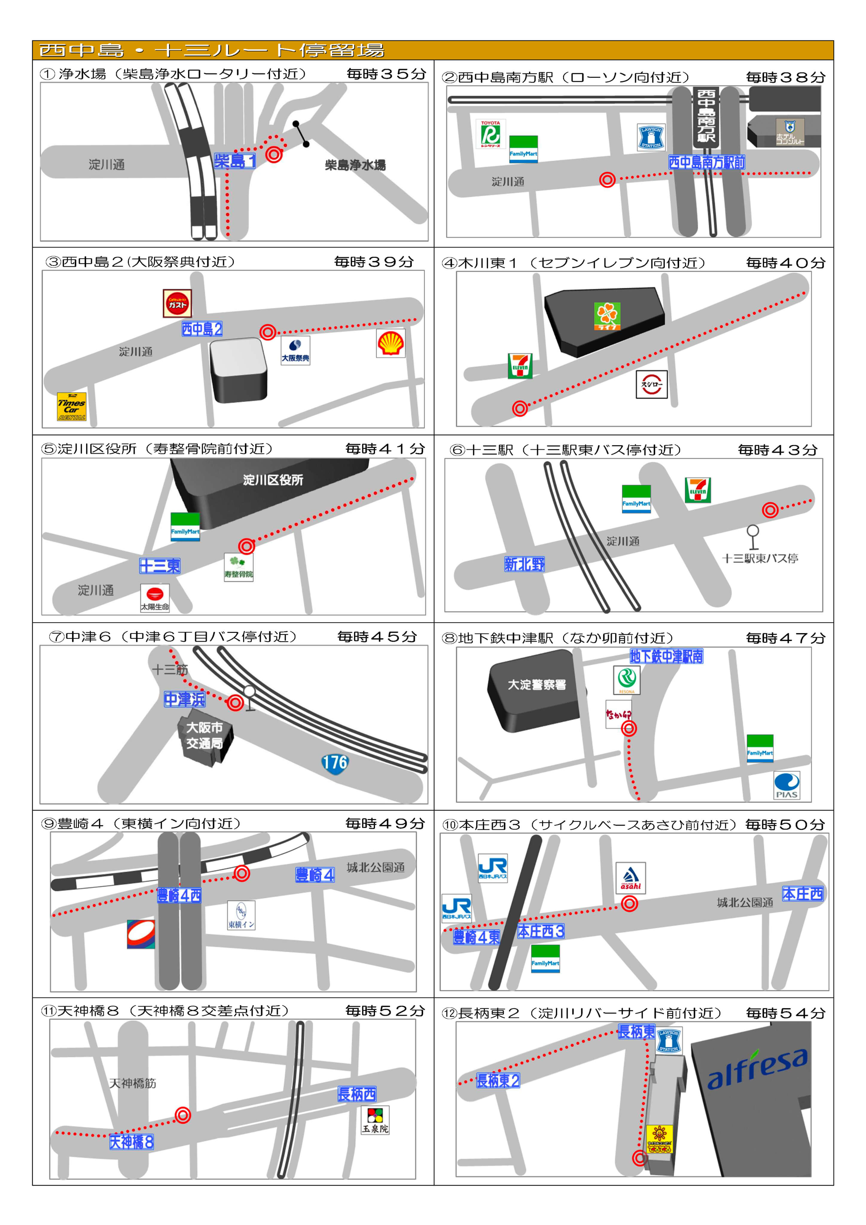 | 便 | 学校発 | 浄水場 | 南方駅前 | 西中島2 | 木川東1 | 区役所 | 十三 | 中津6 | 中津駅 | 豊崎4 | 本庄西3 | 天神橋8 | 長柄東2 | 学校着 |